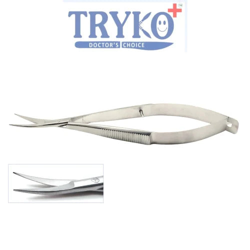 Product Description: The TRYKO+ Castroviejo Scissor, Curved, 7" (AI0395) is a precision surgical instrument designed for delicate tissue dissection and suture cutting, particularly in angled or deep surgical fields. Featuring a distinct flat handle for stable, ergonomic control and curved, fine blades for navigating around anatomical structures, this scissor is indispensable for procedures requiring high precision. Crafted from superior 410 and 304 grade surgical stainless steel, it offers excellent corrosion resistance, longevity, and is fully autoclavable. The spring-action mechanism ensures smooth, responsive cutting with minimal effort, reducing surgeon fatigue during intricate tasks. Proudly manufactured in Jalandhar City, Punjab, India, with ISO and CE certifications, TRYKO+ Castroviejo Scissors are a reliable choice for demanding surgical environments.