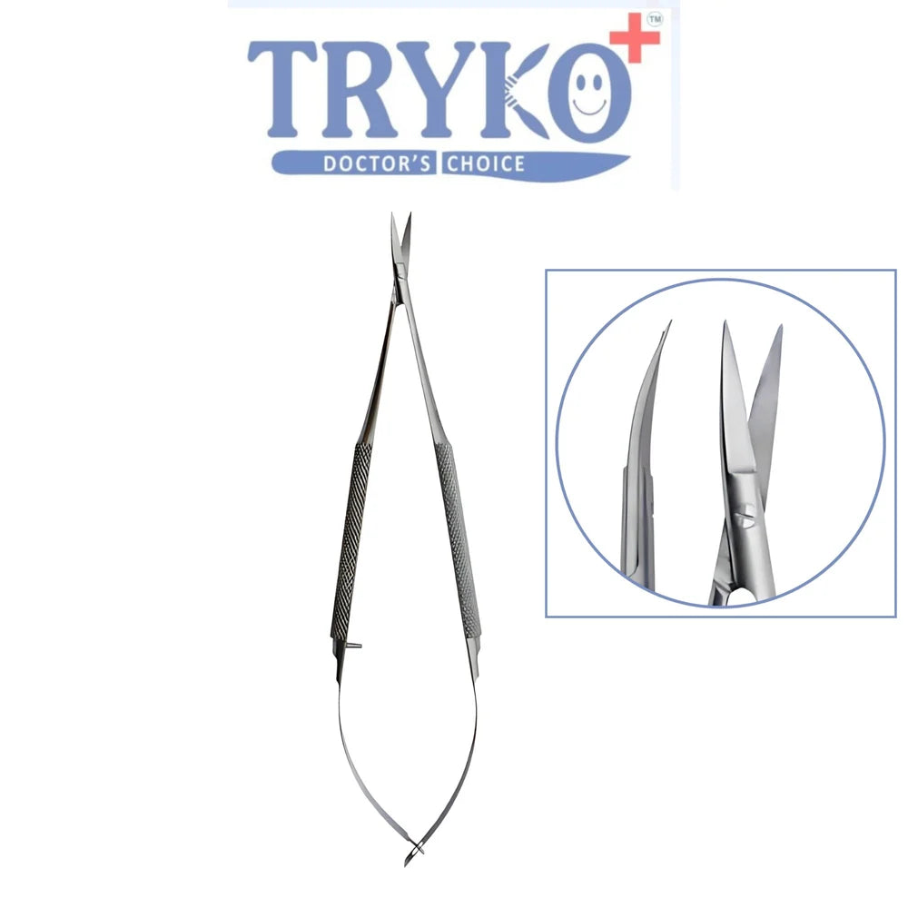 Product Description: The TRYKO+ Castroviejo Scissor, Curved, 8" (AI0402) is a precision surgical instrument designed for delicate tissue dissection and suture cutting, particularly in angled or deep surgical fields requiring precise rotational maneuvers. Engineered with a distinctive round handle for optimal micro-control and curved, fine blades for navigating around anatomical structures, this scissor is indispensable for procedures requiring high precision. Crafted from superior 410 and 304 grade surgical stainless steel, it offers excellent corrosion resistance, longevity, and is fully autoclavable. The spring-action mechanism ensures smooth, responsive cutting with minimal effort, enhancing control during intricate tasks. Proudly manufactured in Jalandhar City, Punjab, India, with ISO and CE certifications, TRYKO+ Castroviejo Scissors are a reliable choice for demanding surgical environments.