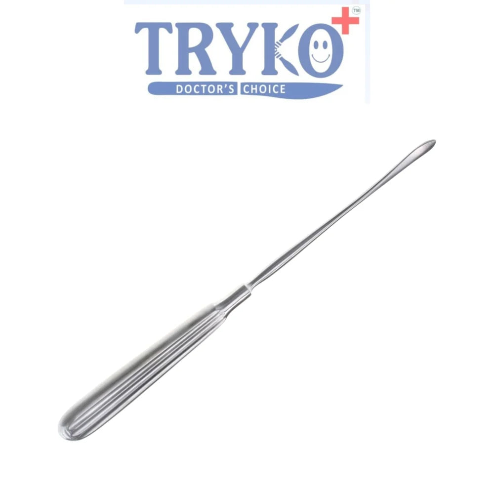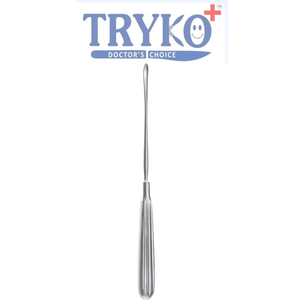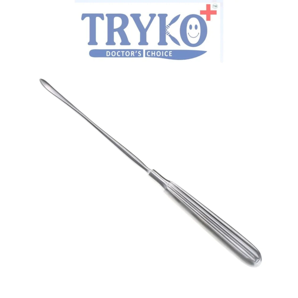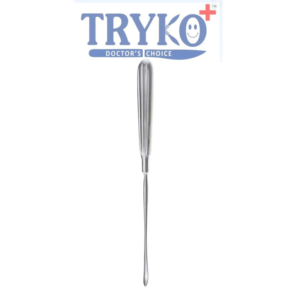 Product Description: The TRYKO+ Cushing Periosteal Elevator, 15mm (AI0460) is a specialized surgical instrument designed for the meticulous elevation of the periosteum from bone. This elevator is an essential tool in neurosurgery, orthopedics, and maxillo-facial surgery, where its purpose is to create a clear surgical field by separating the bone from its surrounding soft tissue. The instrument features a 15mm wide, blunt tip, which is expertly shaped to glide smoothly along the bone surface, ensuring atraumatic tissue separation and minimizing damage. The ergonomic handle provides a balanced feel and a secure grip, enabling the surgeon to apply controlled force with accuracy. Crafted from high-grade, autoclavable surgical stainless steel, this elevator is durable, reliable, and built to withstand the rigors of repeated use.